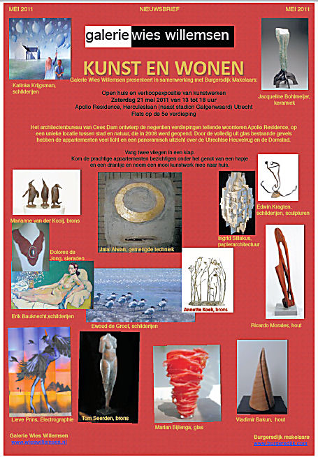 Galerie Wies Willemsen presenteert in samenwerking met Burgersdijk Makelaars: open huis en verkoopexpositie van kunstwerken op 21 mei 2011 van 13 tot 18 uur. Apollo residence, Herculeslaan (naast stadion Galgenwaard), Utrecht. Flats op de 5e verdieping.
