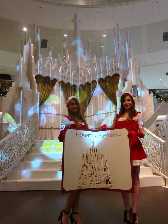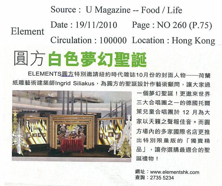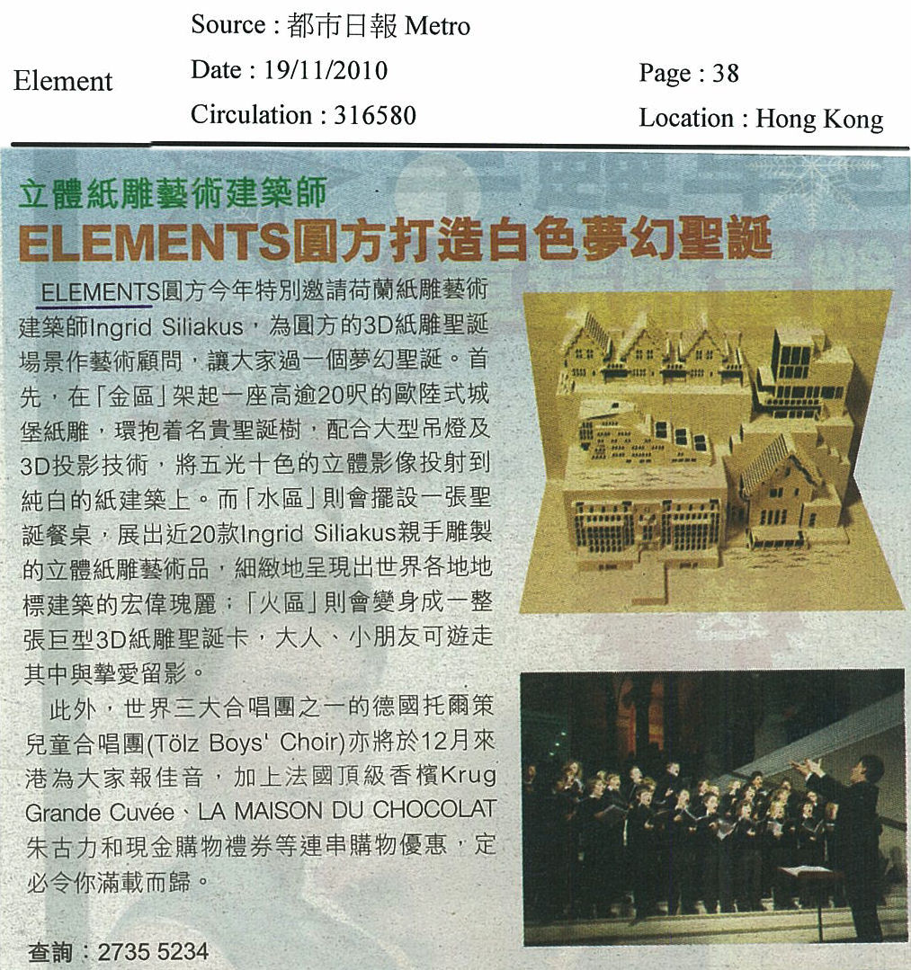 Kerstdecoraties (o.a. een wit kasteel) gemaakt van een ontwerp van Ingrid in shopping Mall 'Elements' te Hong Kong. Zie persbericht op de site van 'Elements': http://www.elementshk.com/eng/elements/detail/000000007.htm